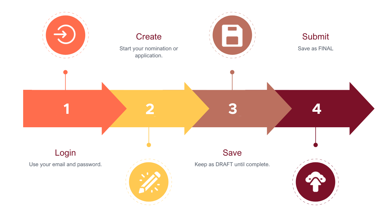 During the Call for Nominations/Applications period, your submission can be saved as DRAFT until all the required information is completed and attachments uploaded. As each section is complete, you will see a